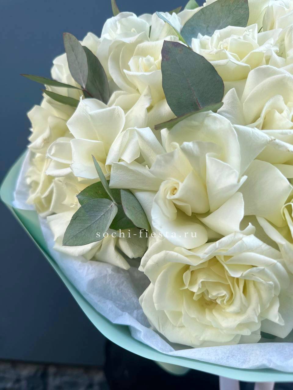 Девятнадцать вывернутых роз собраны в плотный букет, где каждый бутон развернут наружу и демонстрирует сложную структуру лепестков. Белый цвет звучит чисто и уверенно.