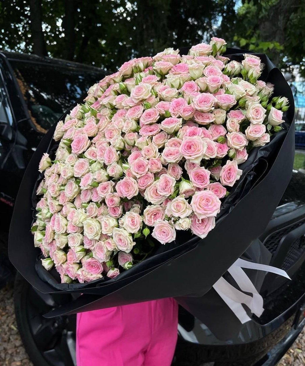Сто один стебель сорта Twister образует монументальную композицию с яркими малиново-белыми переходами. Кустовые розы формируют густую фактуру и впечатляющее присутствие.