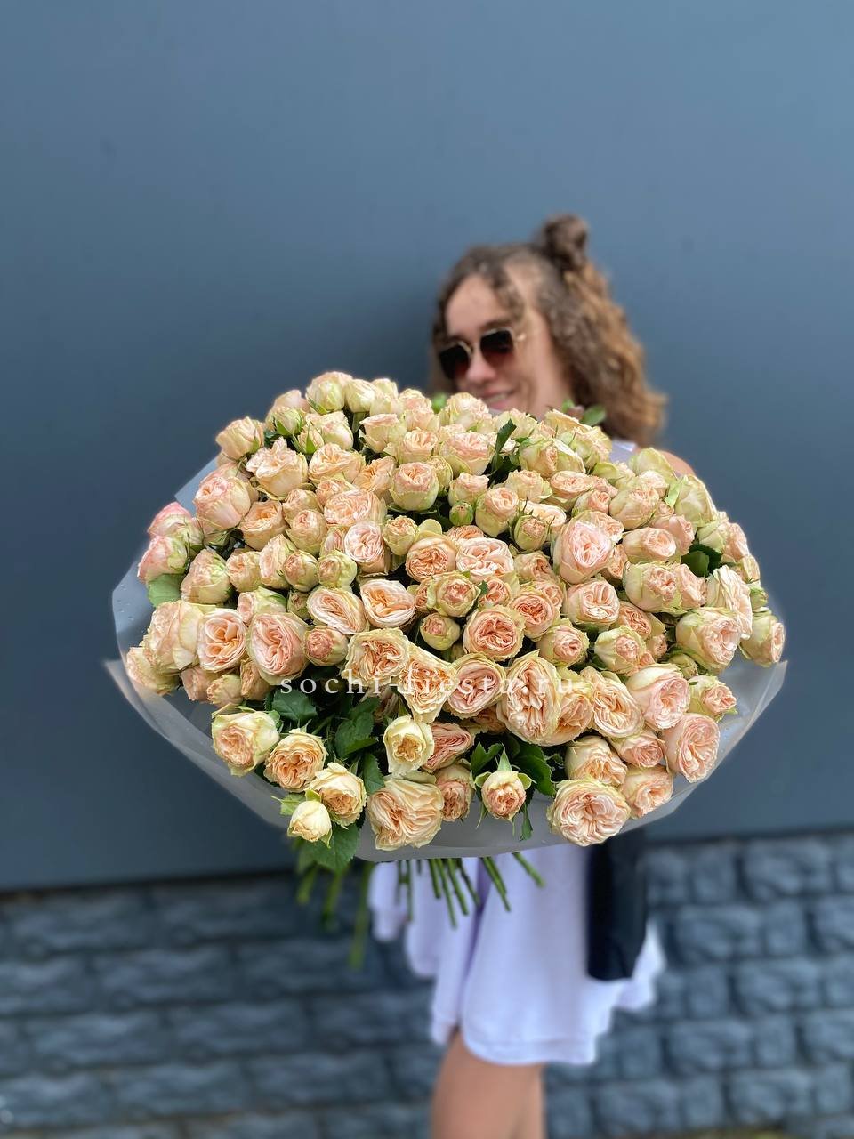 Пятьдесят один бутон образует масштабную композицию, которая притягивает внимание и заполняет пространство. Пионовидные розы создают впечатление цветочного облака с мягкими переливами оттенков.