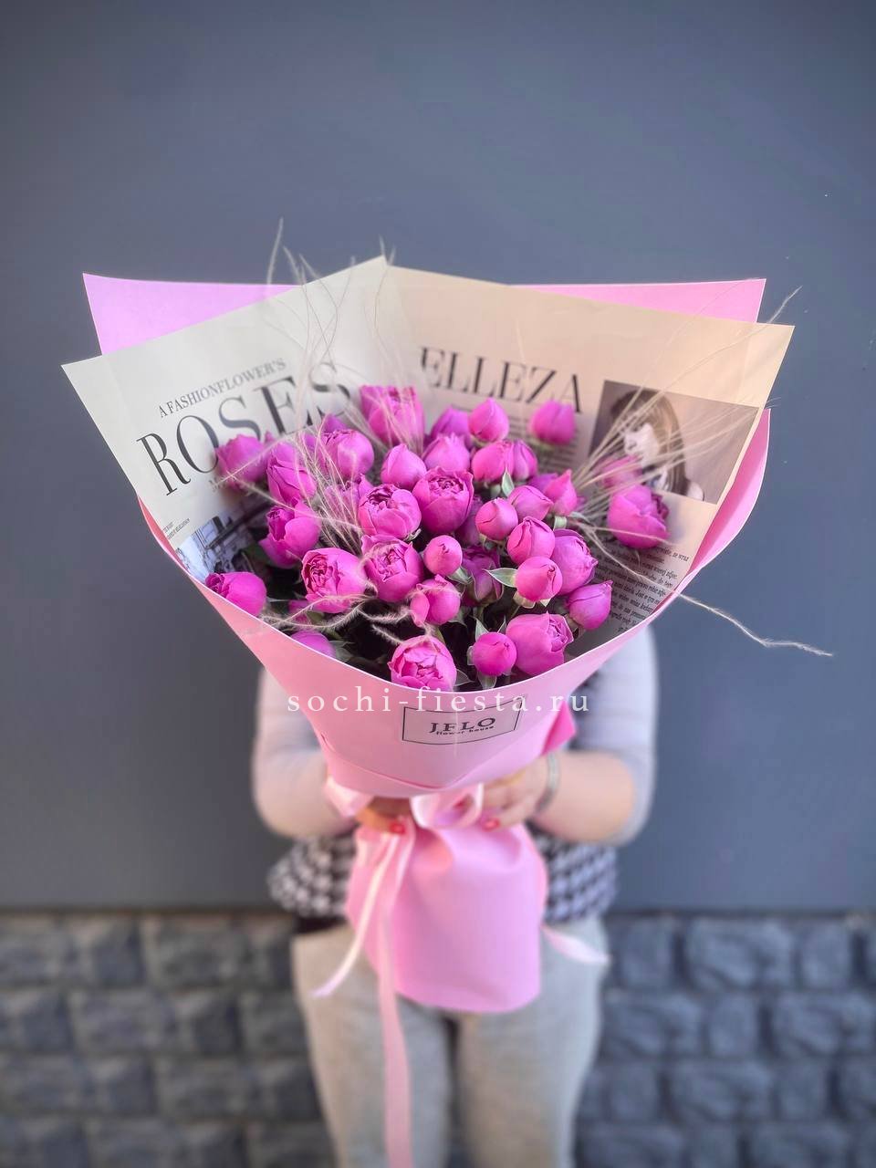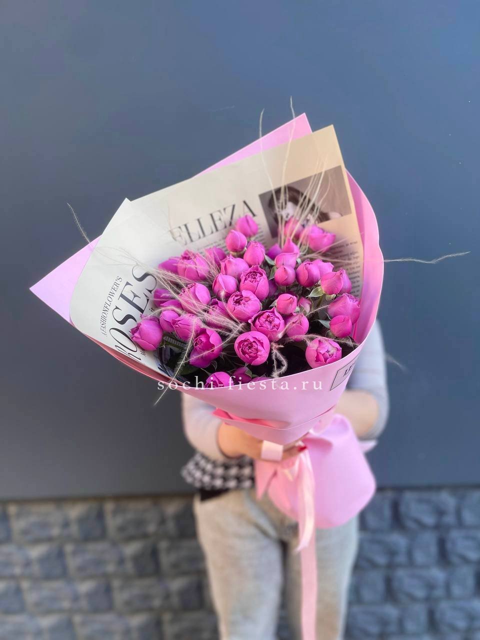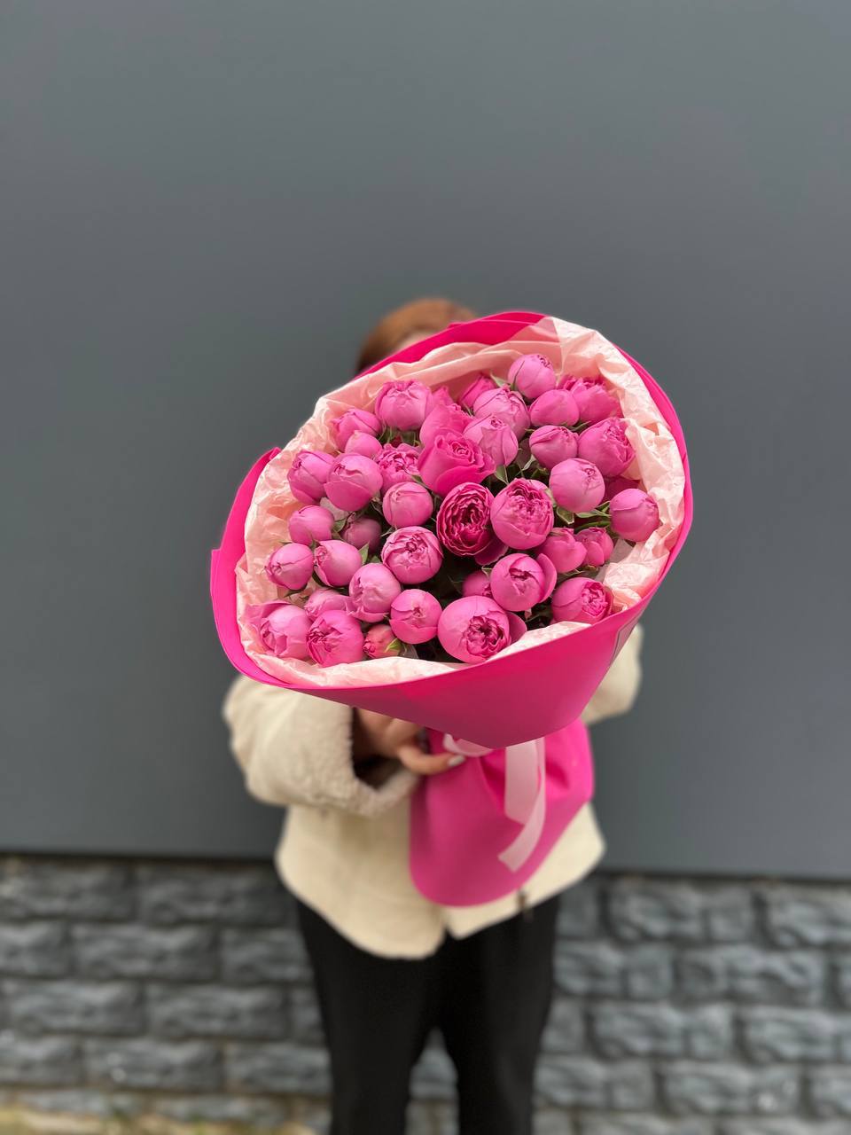 Многолепестковые головки кустовых роз с пионовидной структурой собраны в пышный букет розово-сиреневой гаммы. Крафтовая обёртка сохраняет естественность и подчёркивает густоту бутонов.
