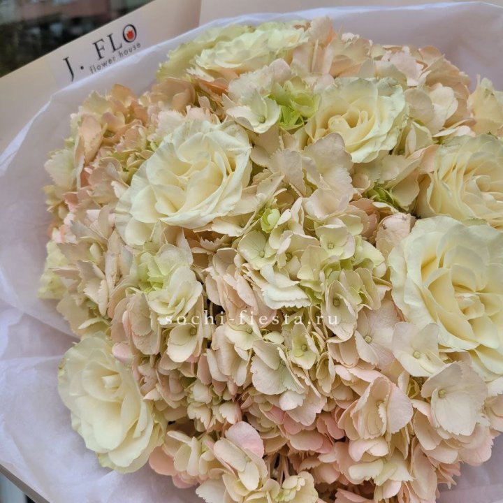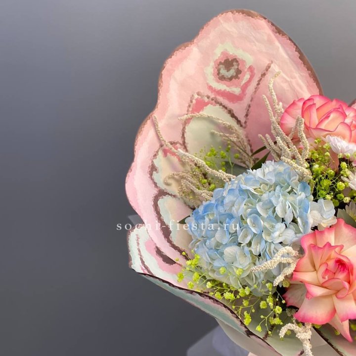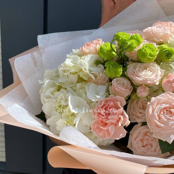- День рождения — объёмный насыщенный букет, розы с пионами в сезон.