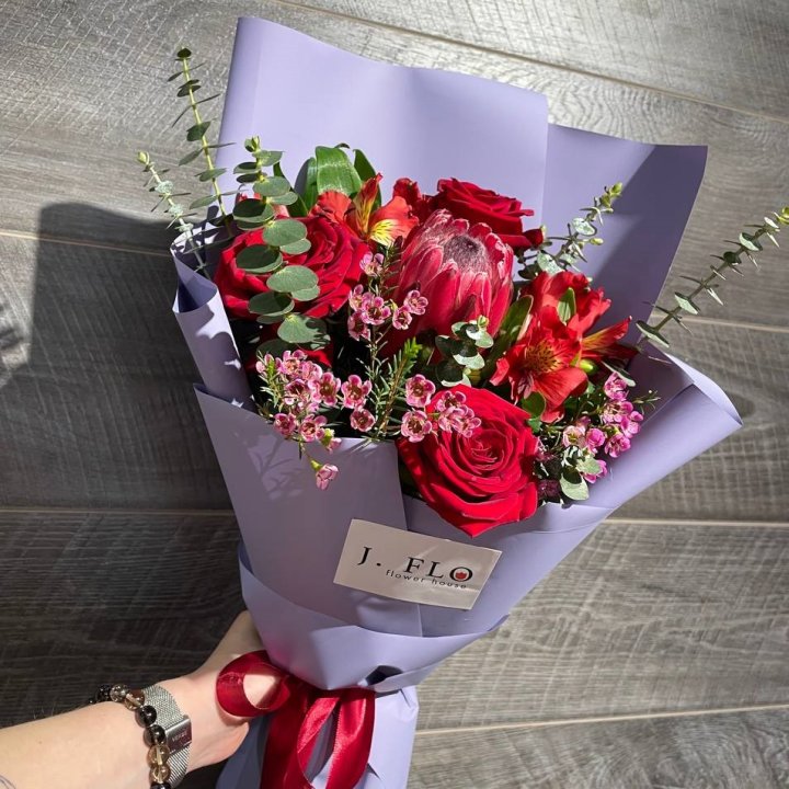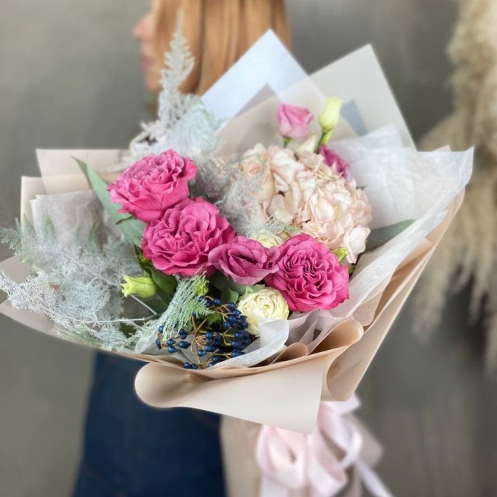 - День рождения — объёмный насыщенный букет, розы с пионами в сезон.