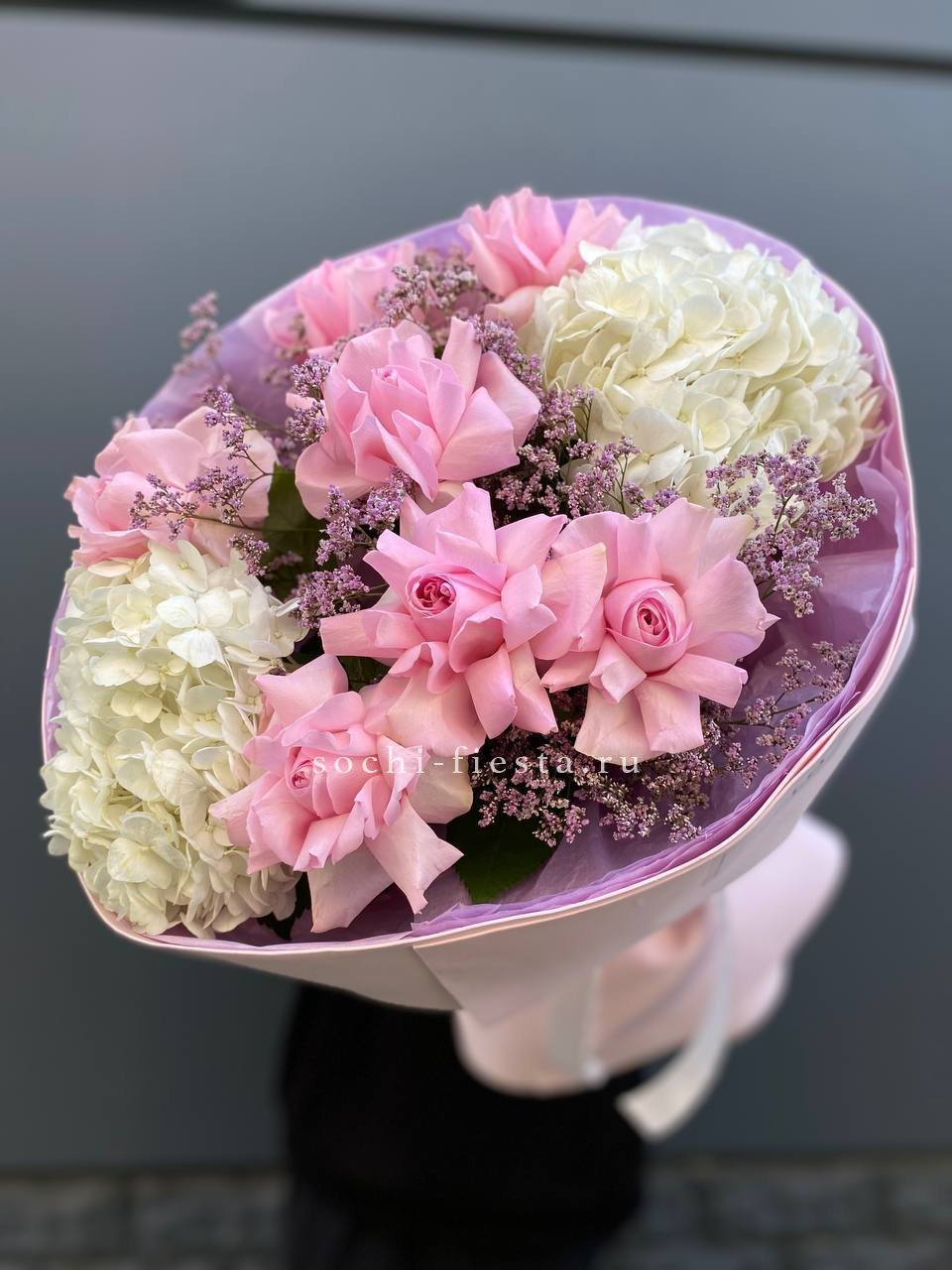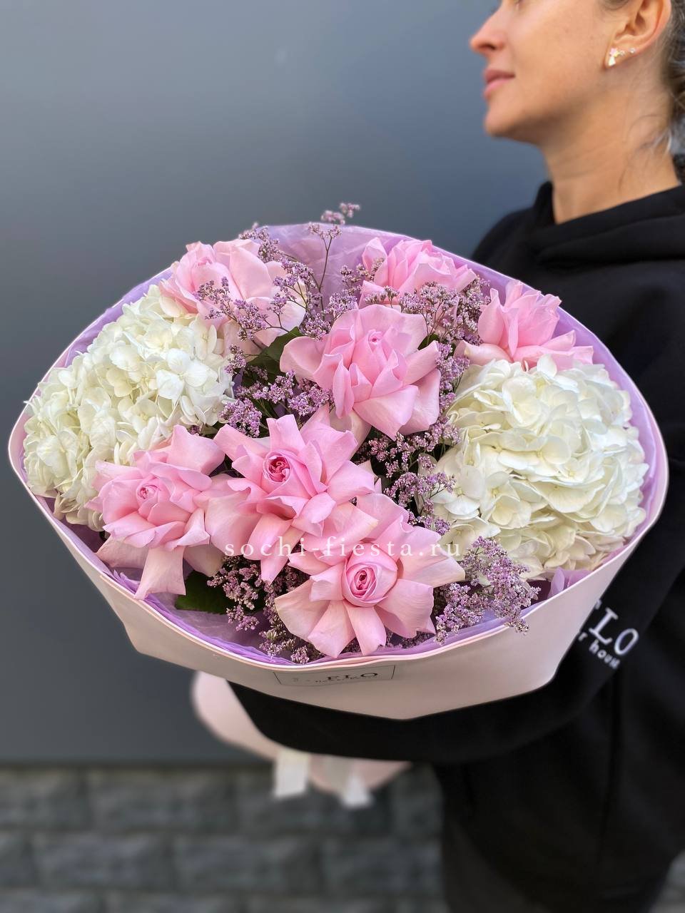 Белые розы и шары гортензии заполняют пространство плотно, но без тяжести. Озатамус вносит лёгкую текстуру, а эвкалипт завершает силуэт спокойной зеленью.