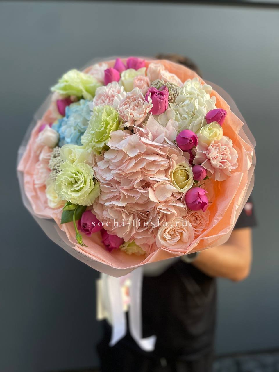 Крупные соцветия гортензии задают основной объем, а эустома и диантус разбивают плотность воздушными бутонами. Мисти баблс и озотамус рассыпаются между цветами, добавляя движение и легкость всей композиции.