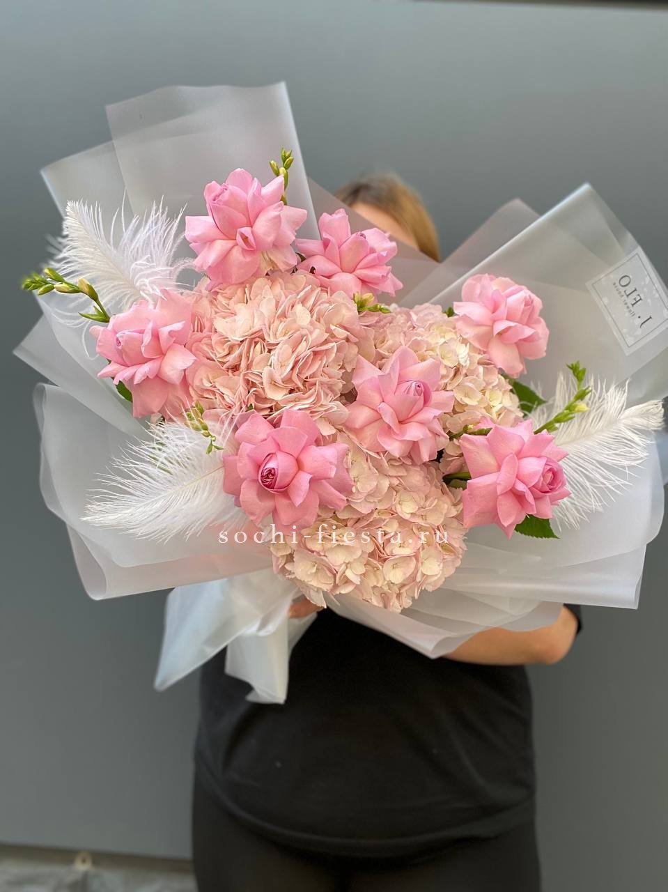 Пышные шапки гортензий создают воздушную основу, сквозь которую проступают розовые бутоны. Перья добавляют графичности и лёгкости всему силуэту.