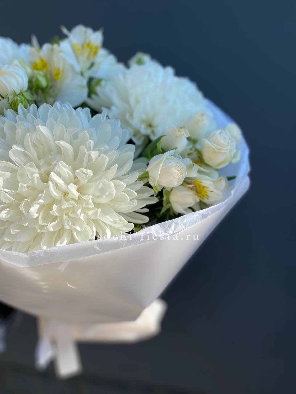 Хризантема Miranda раскрывается пышными соцветиями среди кустовых роз и альстромерий. Плотная структура и природная свежесть сохраняются долго. Композиция для тех, кто ценит надежность и натуральную красоту.