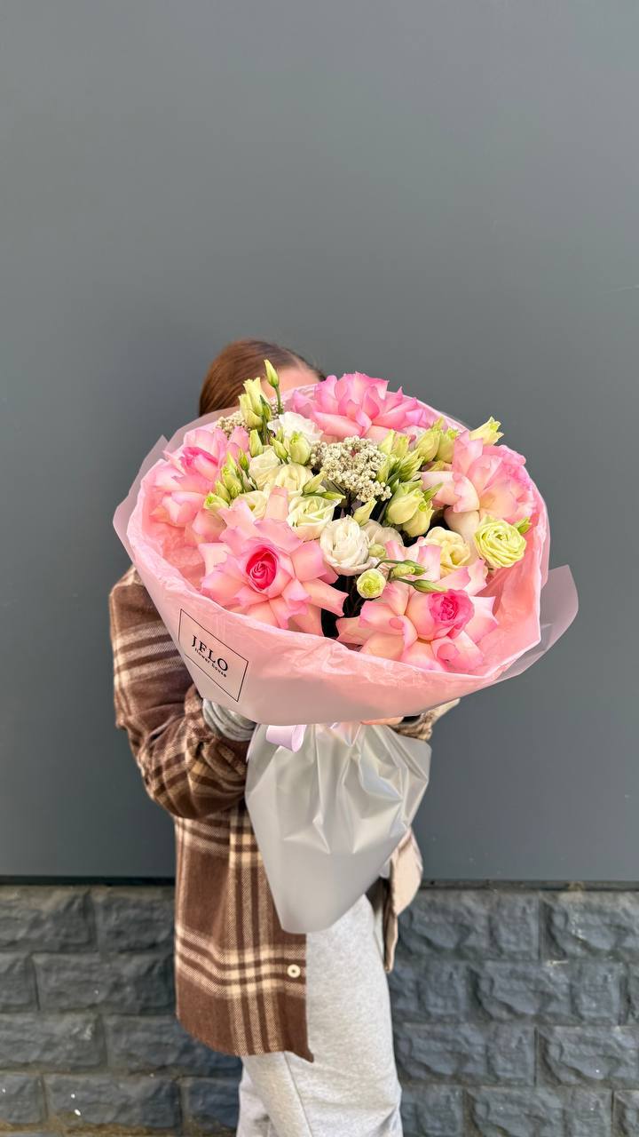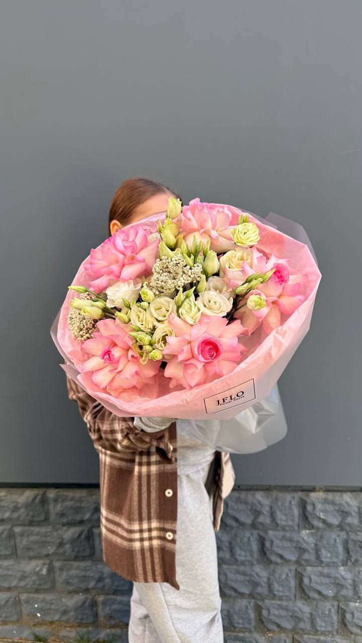 Кустовые розы и эустомы собраны в компактную форму с мягкими линиями. Сочетание нескольких оттенков создаёт живописный эффект без лишней пышности.