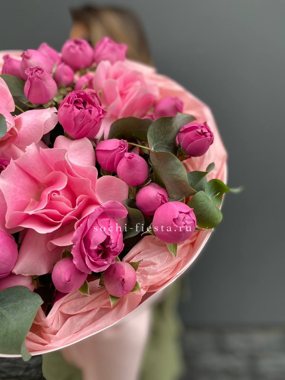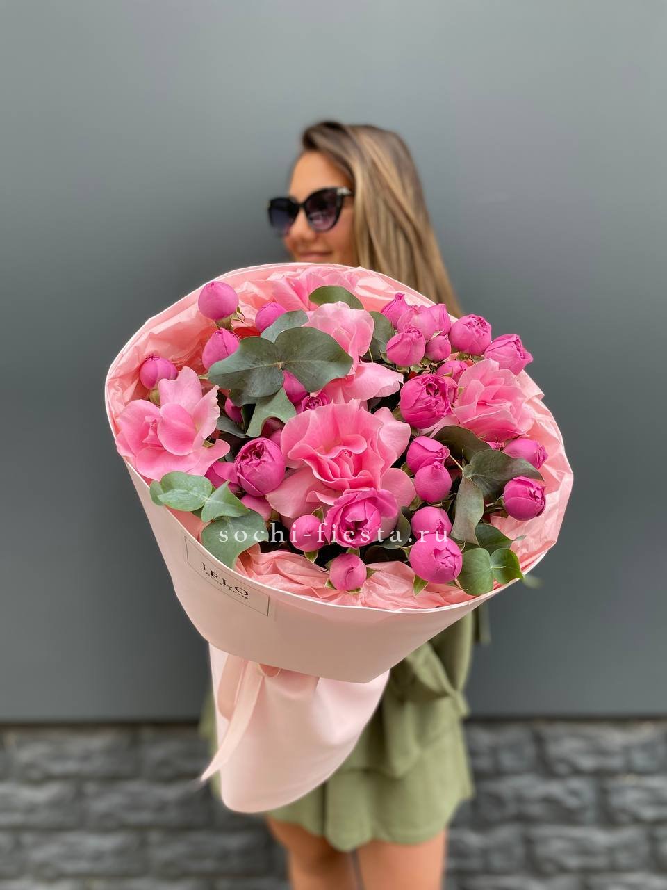 кустовые розы, гортензии, французские розы, диантусы, эустомы, лента и дизайнерская пленка.