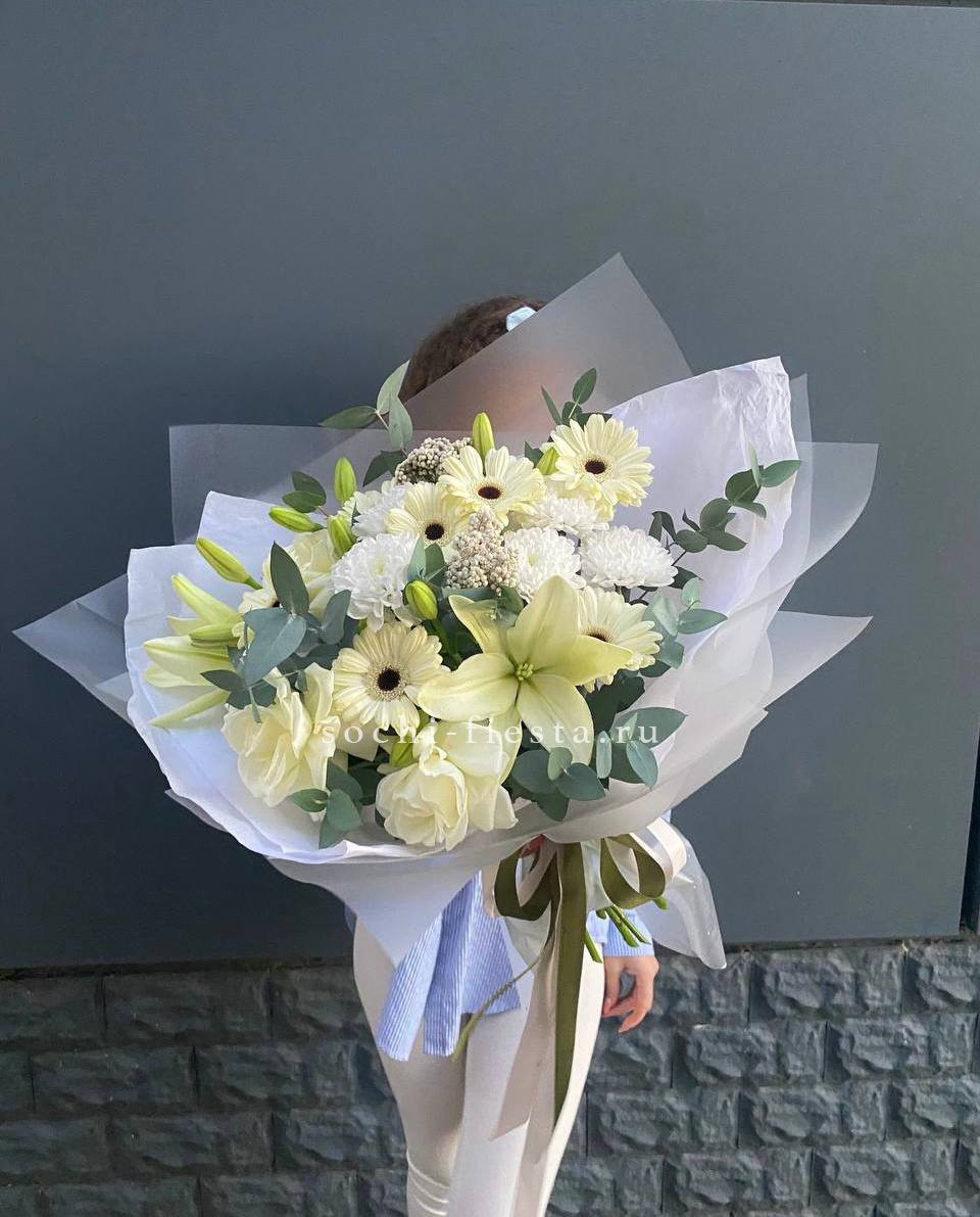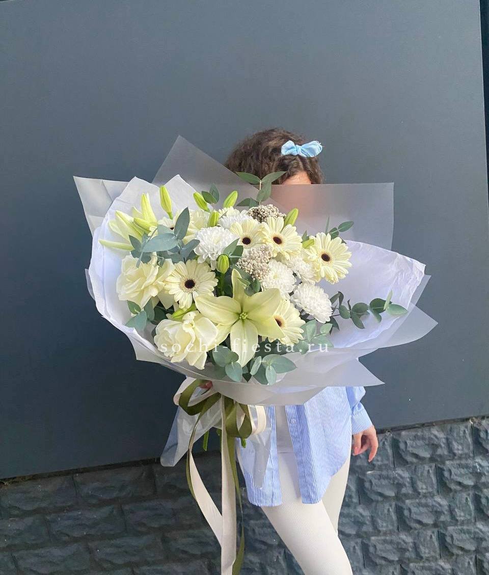 Монохромная палитра с многослойной структурой. Французские розы и эустомы чередуются с кустовыми бутонами, гортензии заполняют объём, а диантусы создают точечные акценты. Букет выглядит цельно и графично.