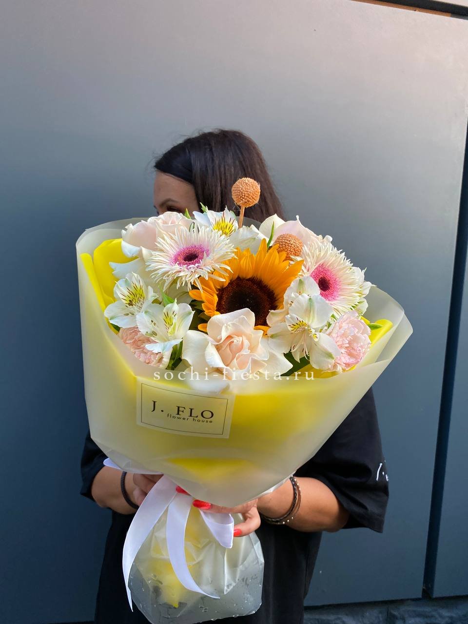 Солнечный подсолнух задает тон композиции, где желтые герберы и белые розы создают радостное настроение. Альстромерии и диантусы добавляют воздушности и завершают яркий летний образ.