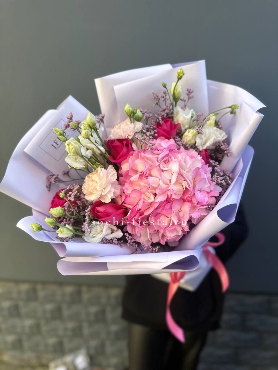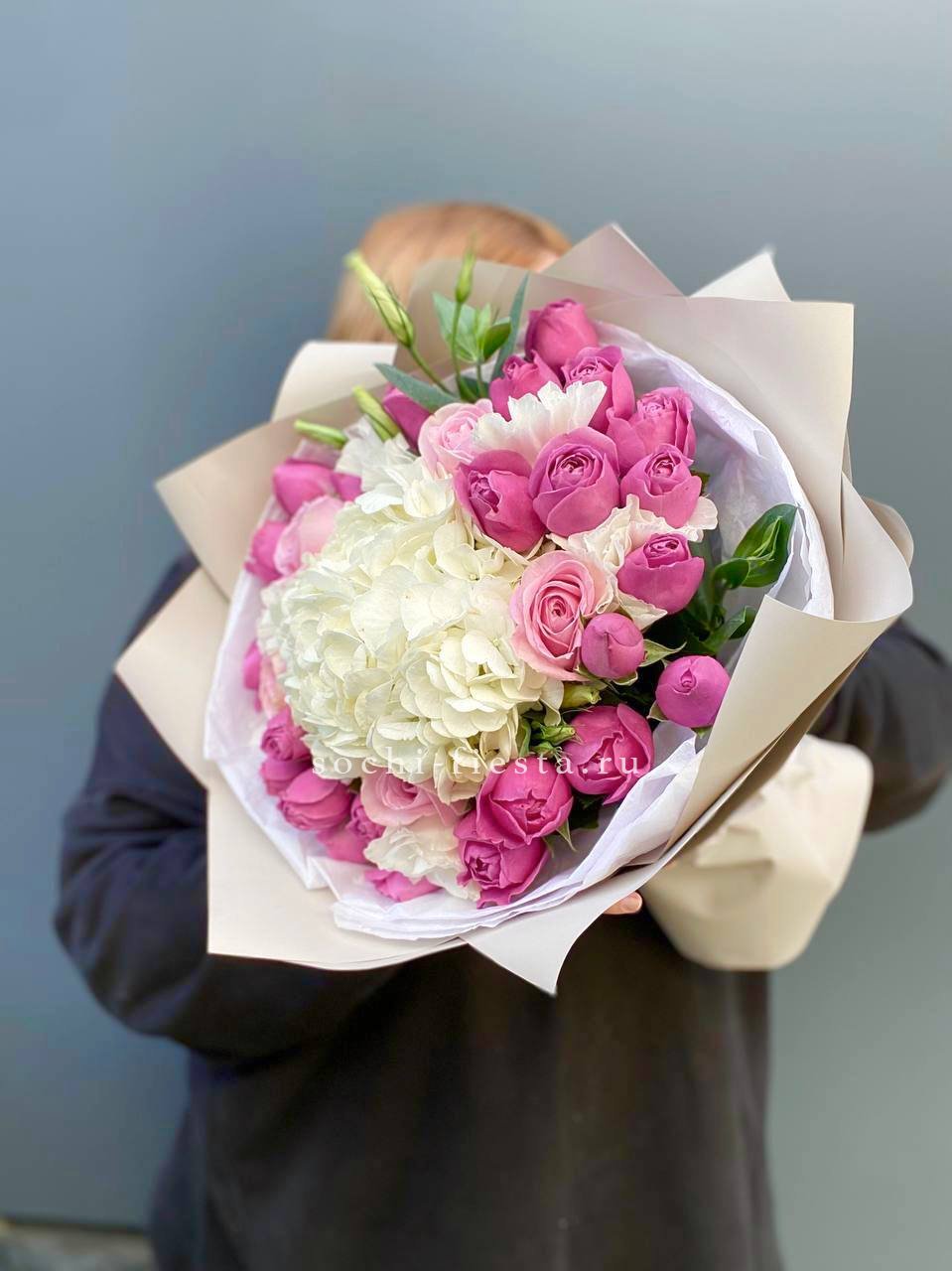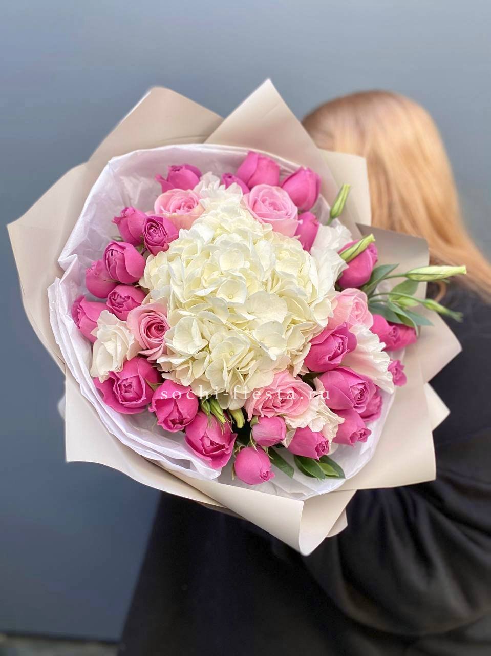 розы, гортензия, альстромерии, маттиола лента и дизайнерская пленка.
