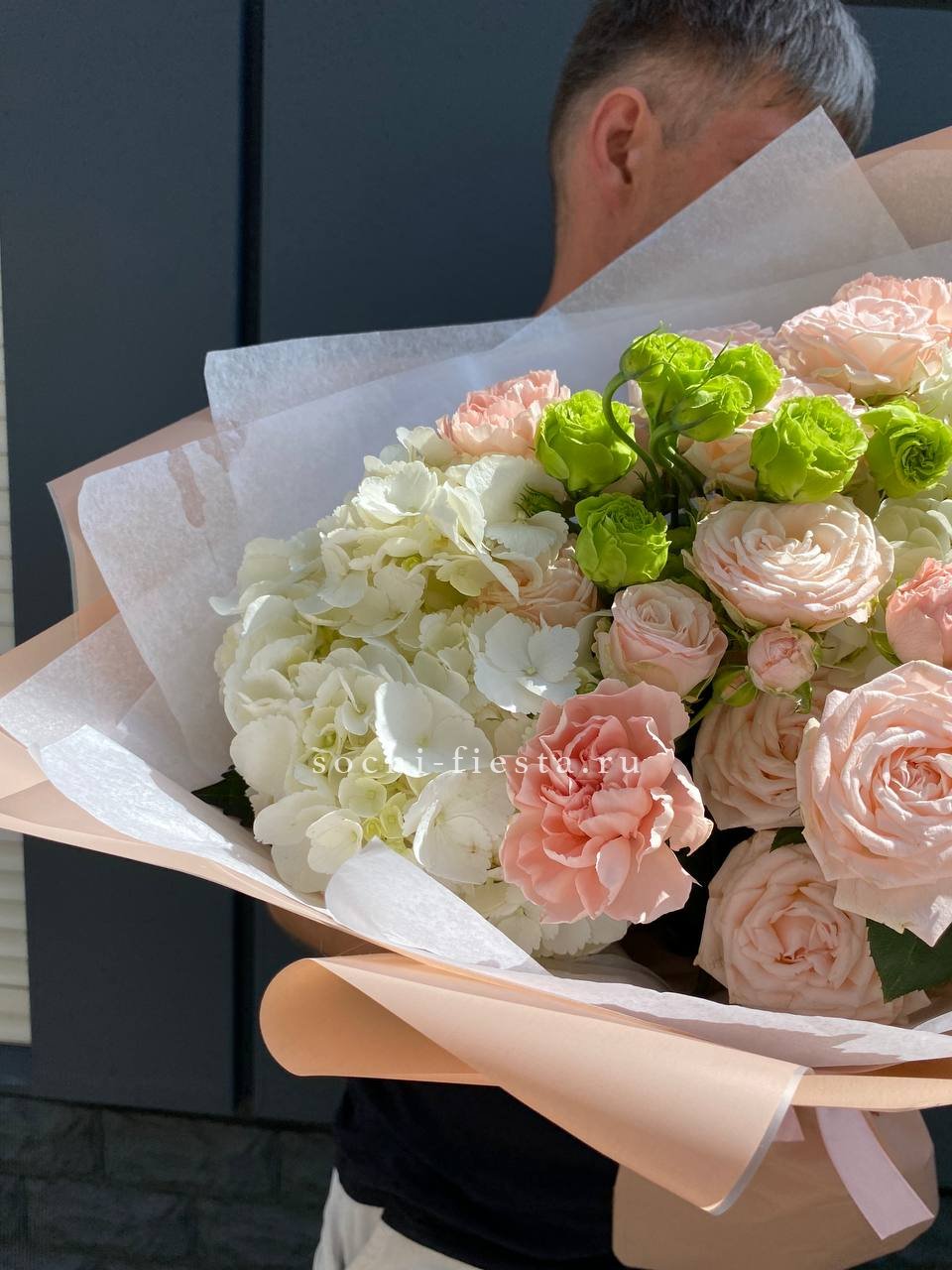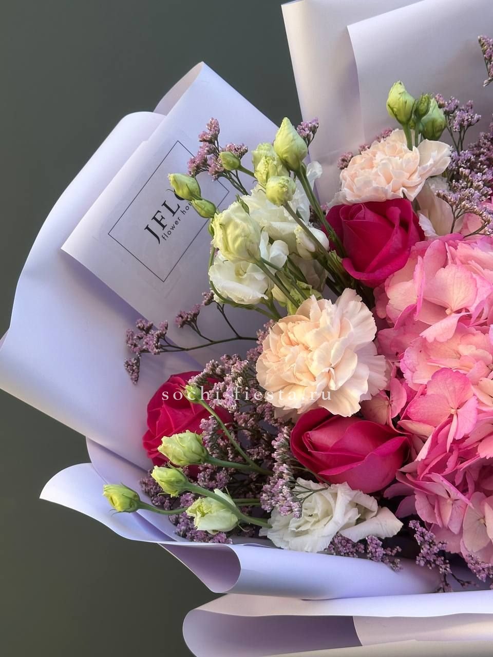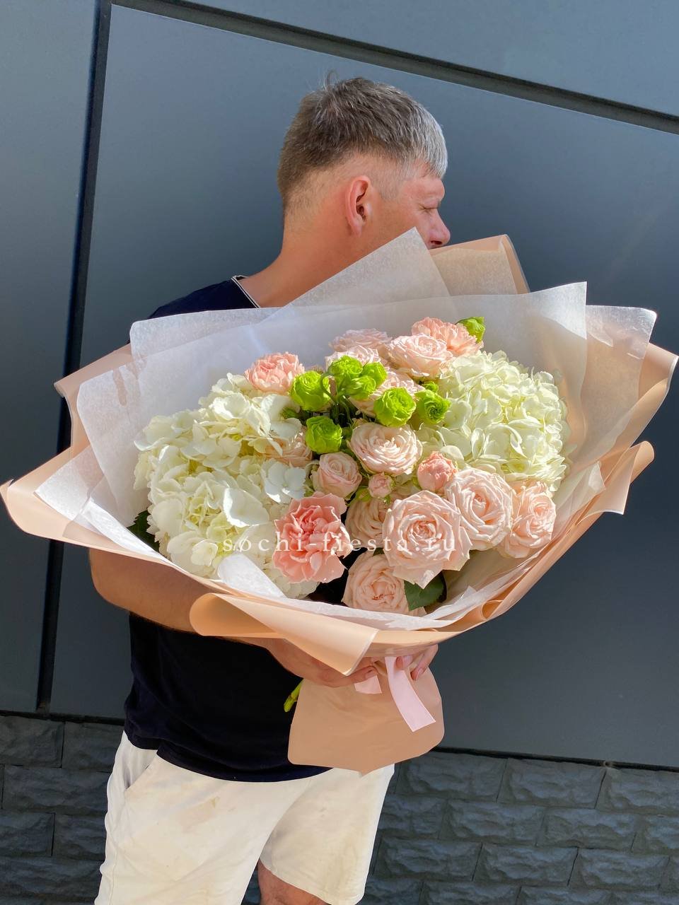 розы, гортензия, альстромерии, маттиола лента и дизайнерская пленка.