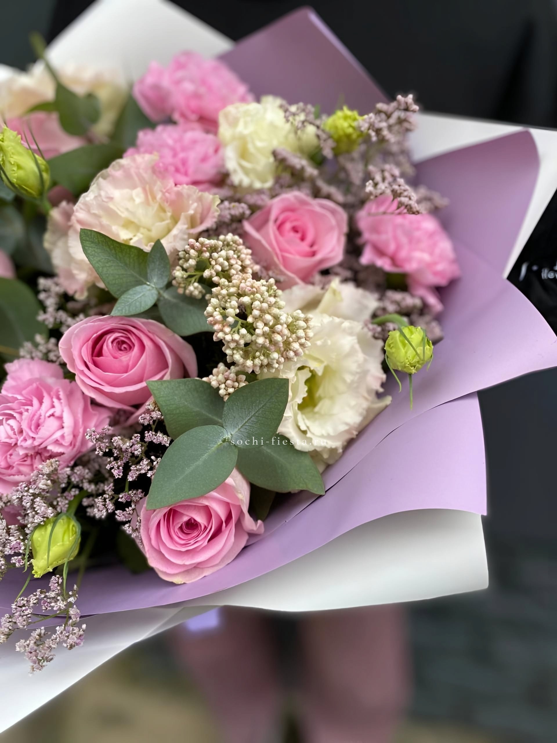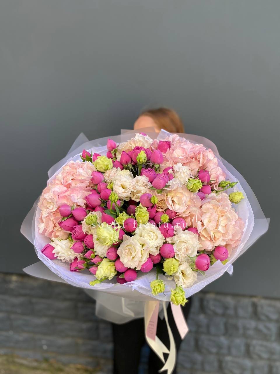 гортензия, пионовидная кустовая роза,  розовая роза, хризантема,  эвкалипт, лента, дизайнерская пленка.