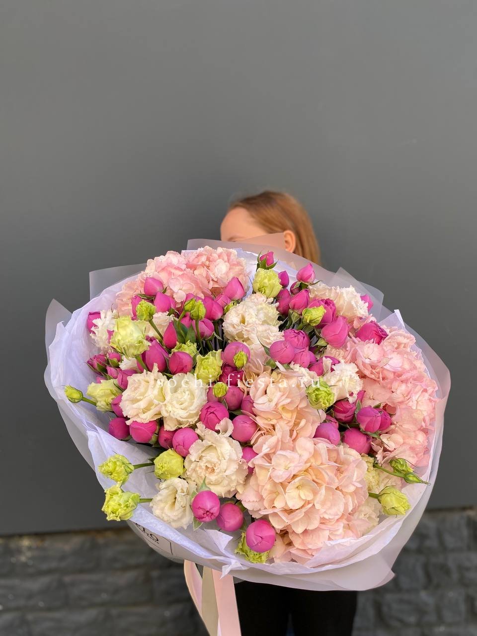 Гортензия формирует воздушную базу, сквозь которую проступают бутоны пионовидной кустовой розы и классических розовых соцветий. Хризантема добавляет графичности и удерживает форму без лишней массивности.