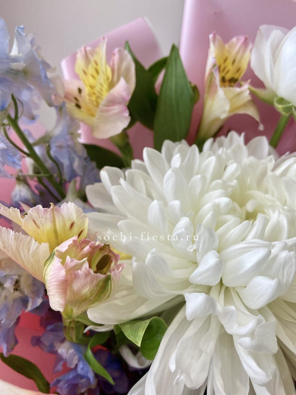 ранункулюс, гербера, альстромерия, хризантема, дельфиниум, авторское оформление.