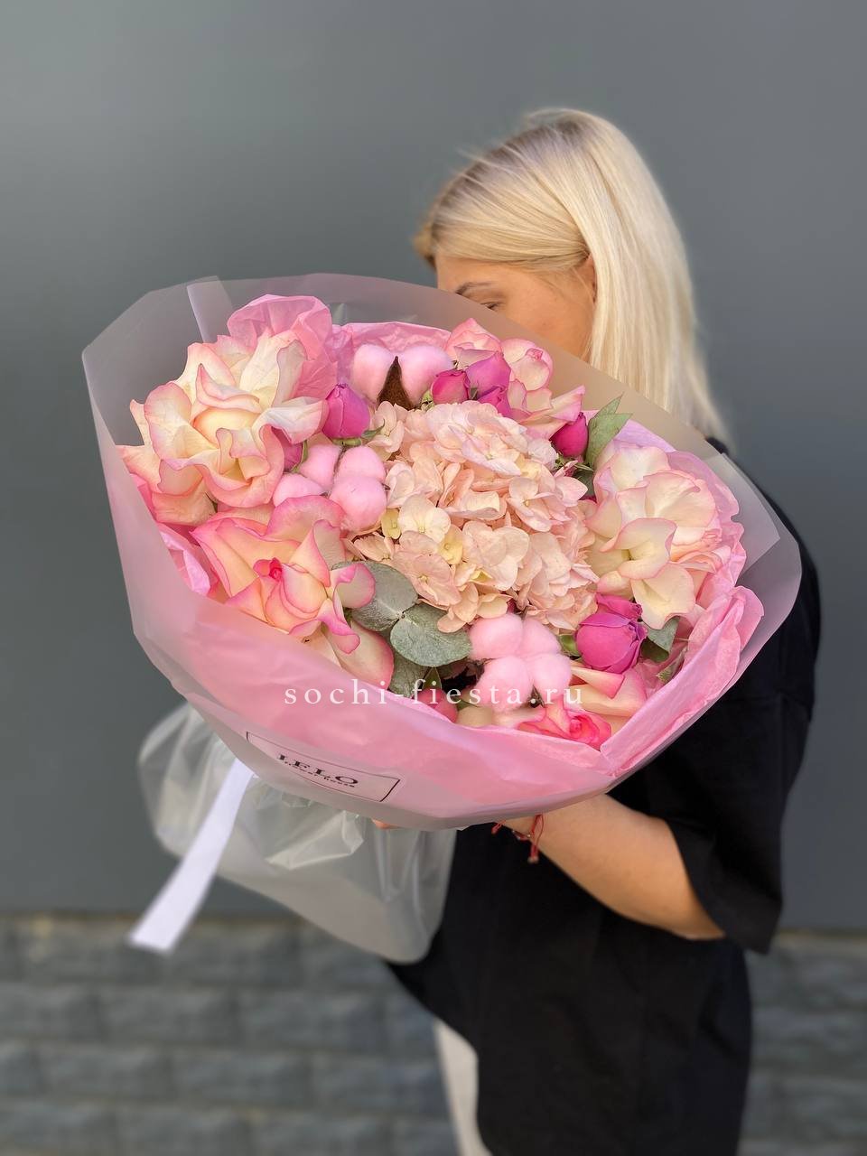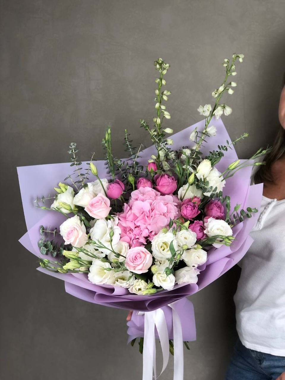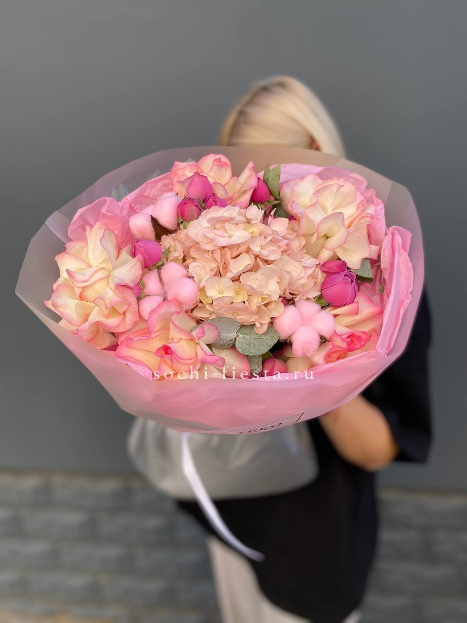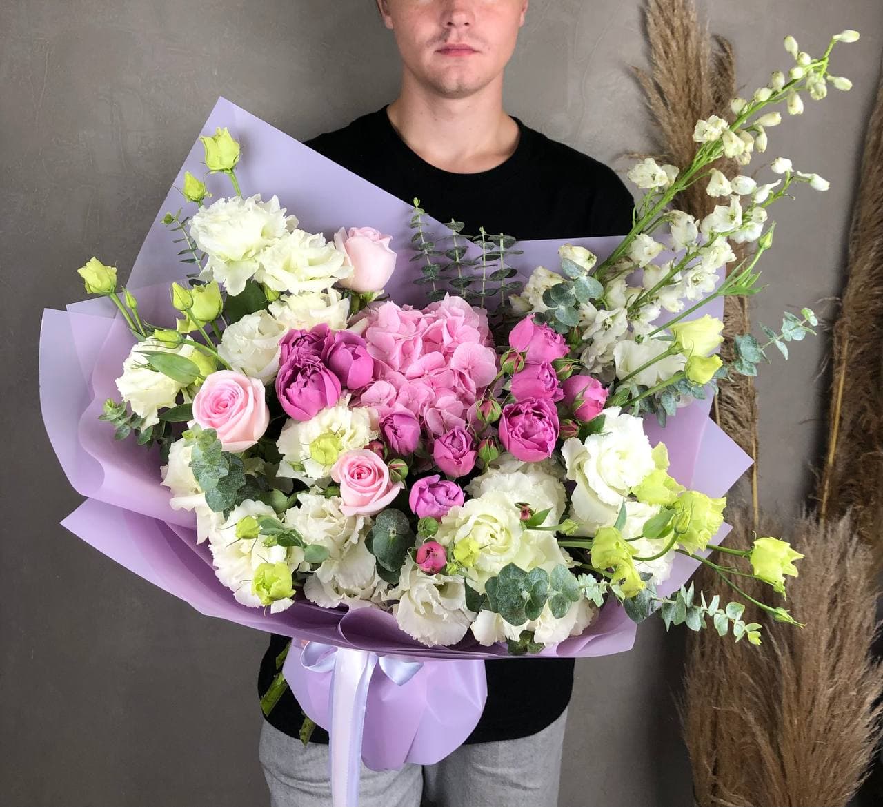 Пышные розовые бутоны переплетаются с воздушной эустомой, создавая объёмную композицию с мягкими переходами оттенков. Микс раскрывается постепенно, удерживая свежесть и форму долгое время. Универсальное решение для самых разных поводов.