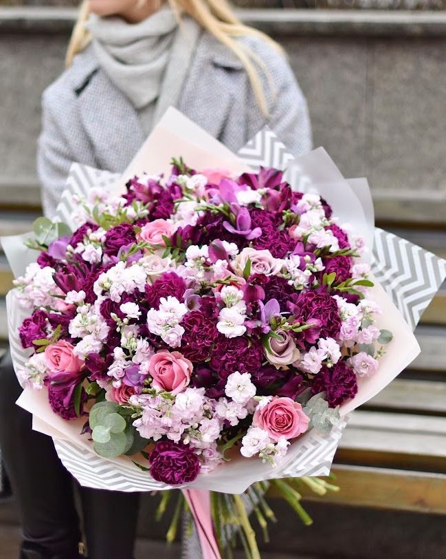 диантусы, розы, маттиола, фрезия, эвкалипт, лента, дизайнерская упаковка.