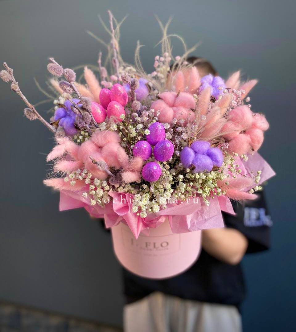 гипсофила, хлопок, верба, ковыль, яйца, лагурус,  тишью, цилиндр D16.