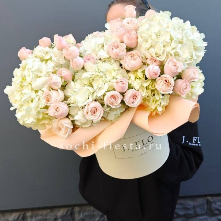 - Шляпная коробка с розами — удобна в волжскую жару: закрытая упаковка лучше держит свежесть.